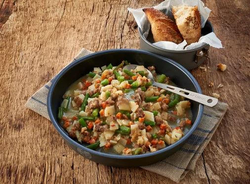 Ingredienser: poteter 28 %, grønne bønner 15 %, storfekjøtt 10 %, solsikkeolje (inneholder melk, E551), favabønner, modifisert stivelse, potetmel, gulrot, skysaus, krydderblanding (inneholder selleri), salt, pepper, hvitløkspulver, spisskummen, ingefær, naturlig aroma. Tilsatt kjøtt: 50 g (tilsvarer ca. 198,2 g ferskt kjøtt). Tilberedning: Rør innholdet i 1630 ml kokende vann og la det stå i 10 minutter. Allergener: melk, selleri